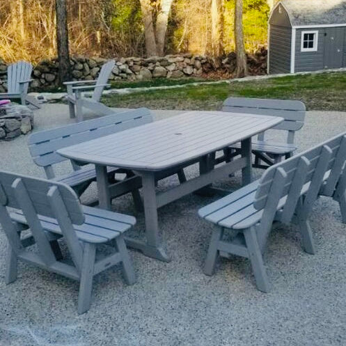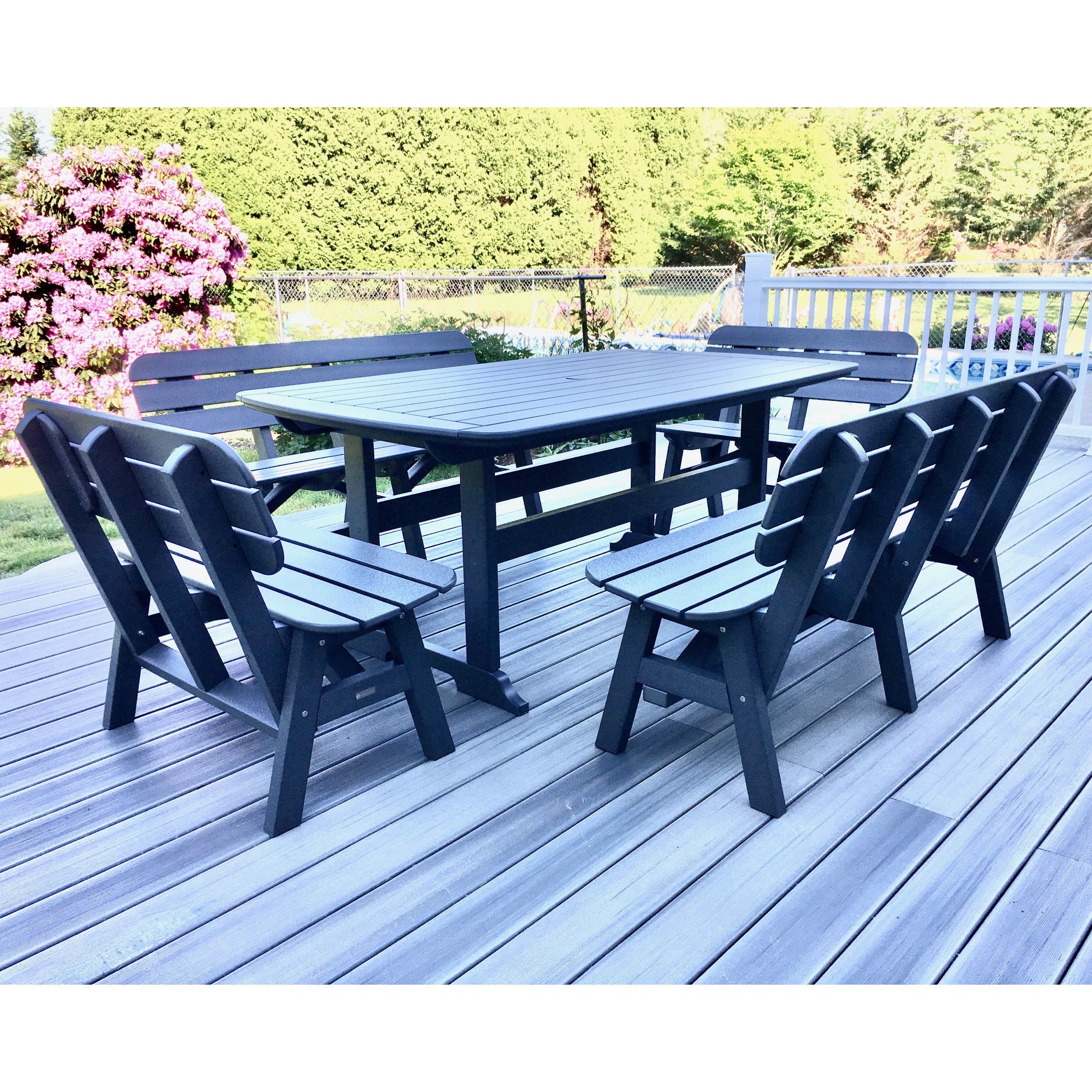 Enhance your outdoor dining experience with the Seaside Casual Portsmouth Dining Table Seating Set. Made with durable materials, this 42 x 72-inch rectangular table comfortably seats four guests. The set is perfect for seaside homes and features four Portsmouth benches for additional seating.